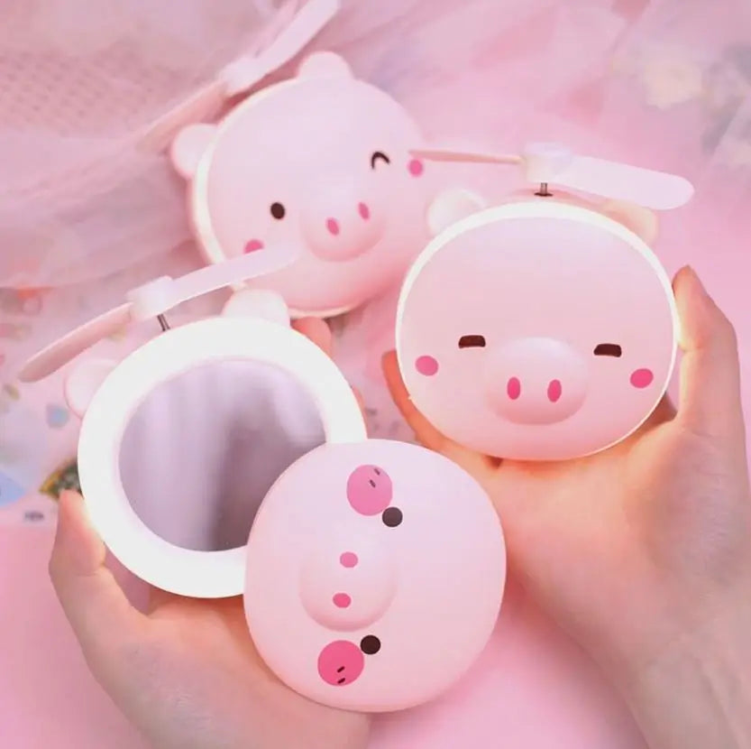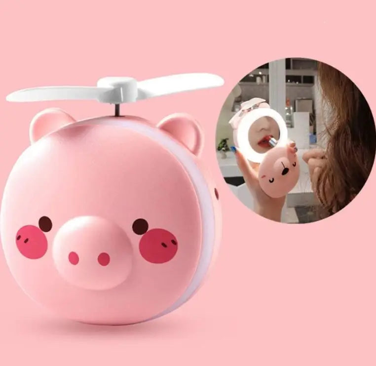 Espelho de Maquiagem Portátil com LED, Ventilador Mini USB e Design Divertido